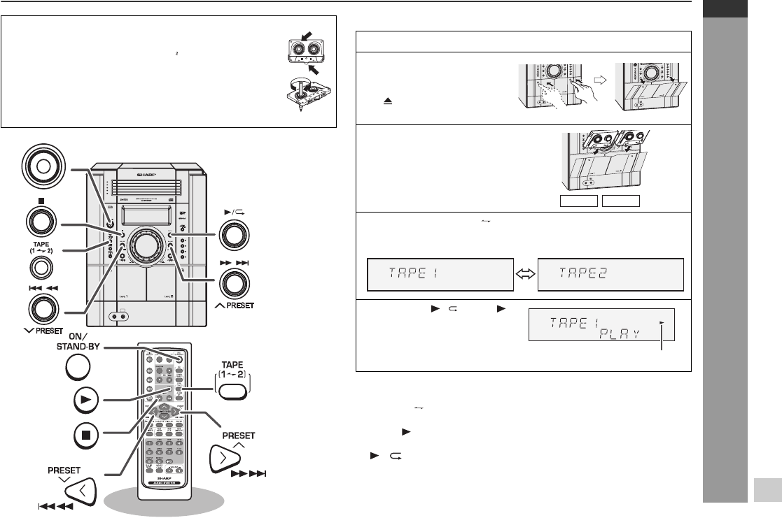TAPE (1 2) button (main unit and remote control): The unit turns