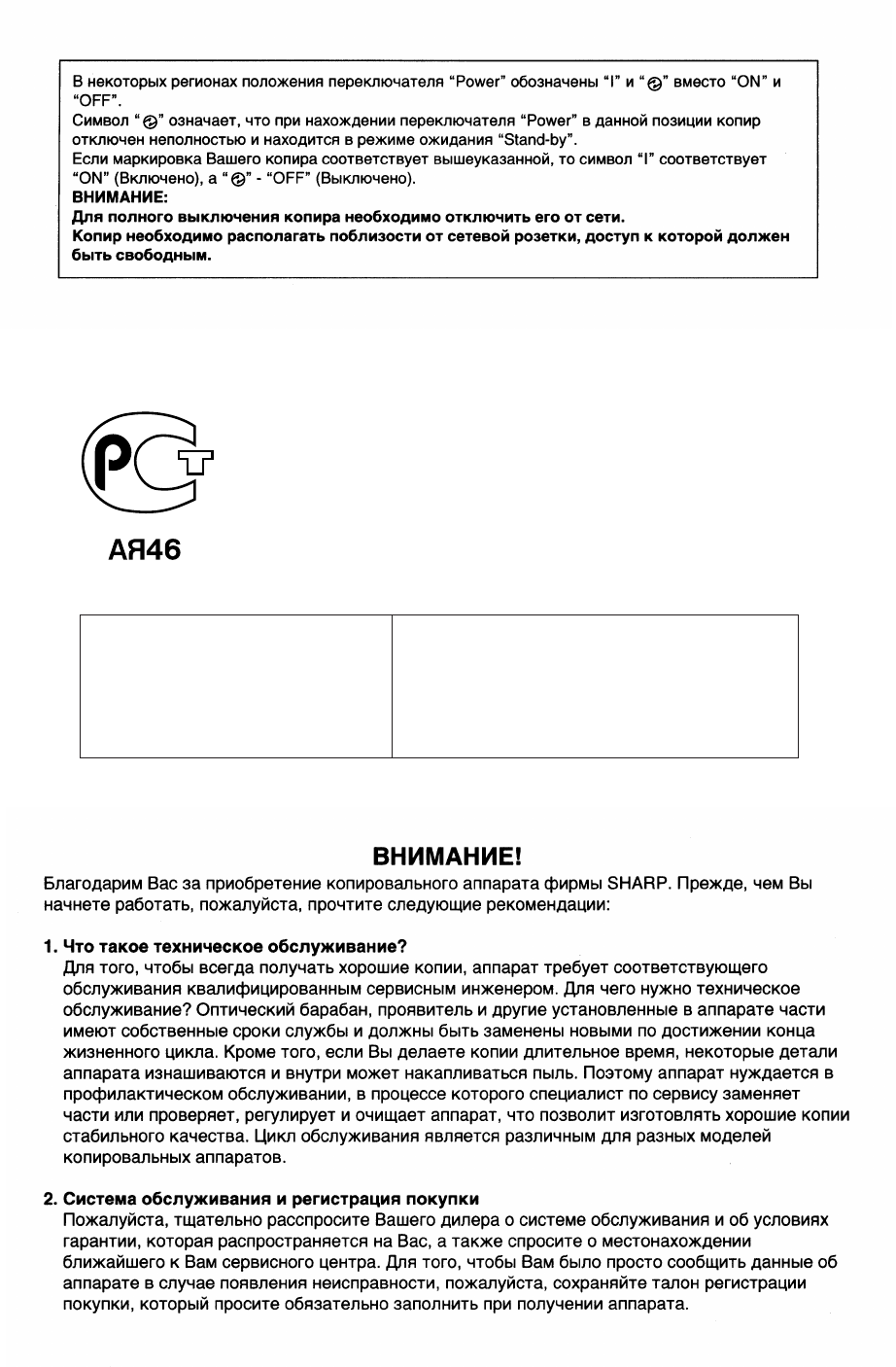Модель AL-1000/1200 ШАРПсоответствует требованиямнормативных документов:по безопасности - ГОСТ Р 50377-92,- ГОСТ 12.2.007.0-85по ЭМС - ГОСТ 23511-79ИН