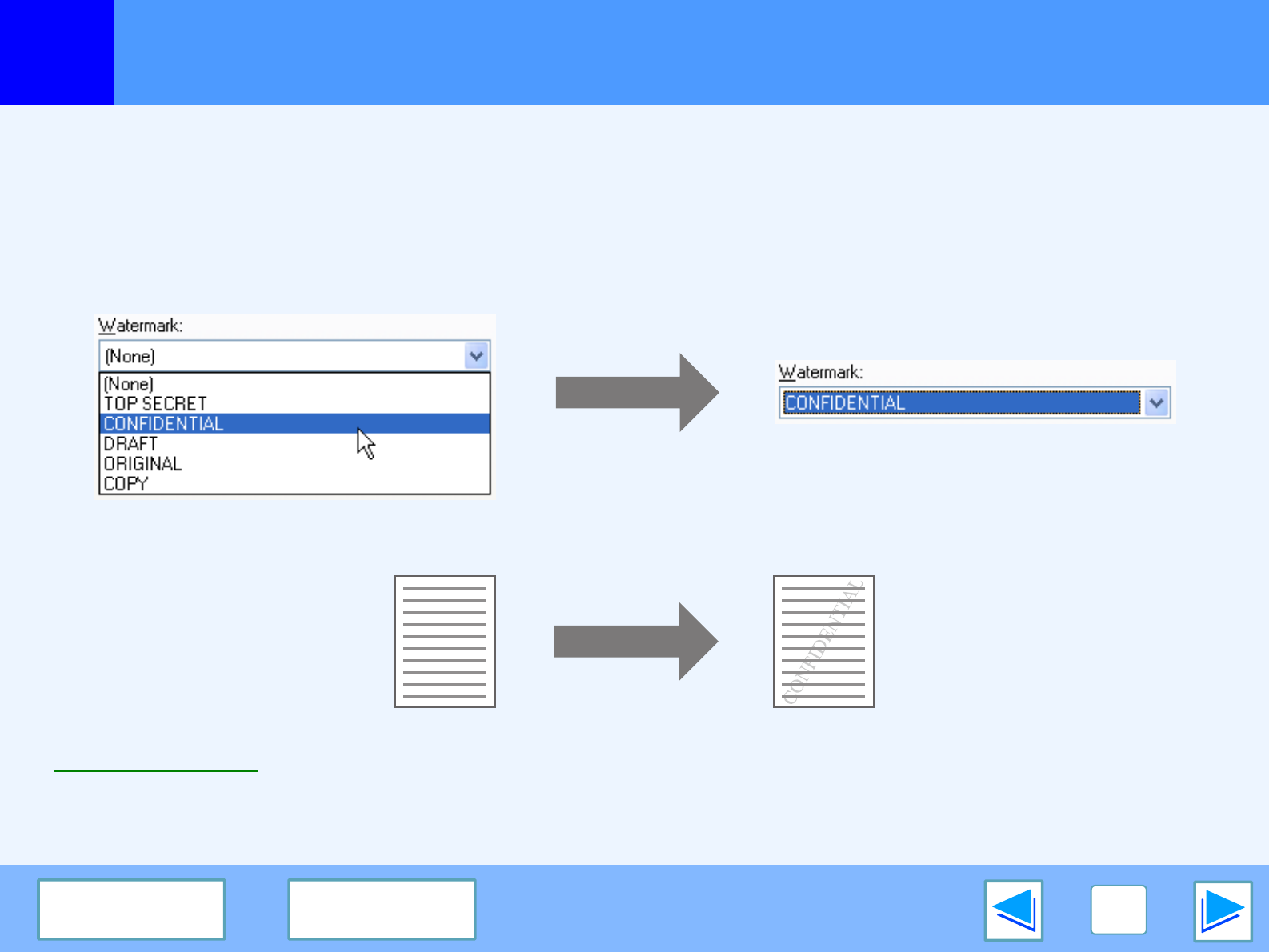 You can print a watermark such as "CONFIDENTIAL" on your document. To print a watermark, open the printer driver, click the