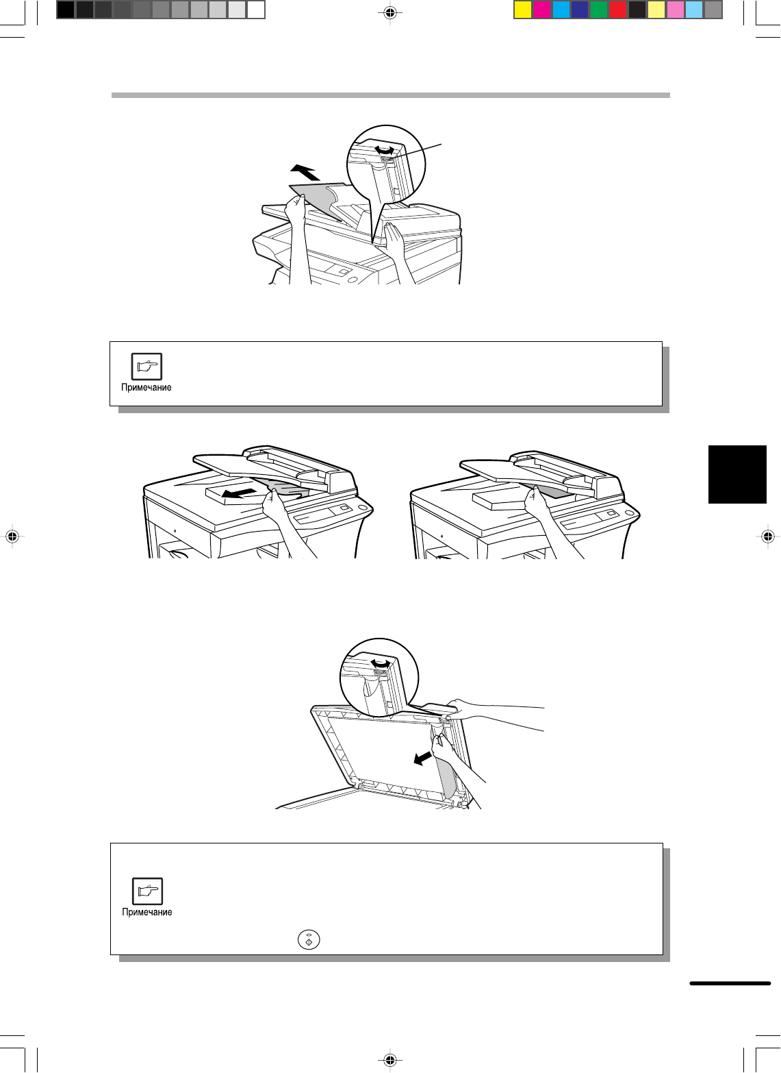 Для того, чтобы удалить застрявший оригинал из устройства RSPF, вытащите