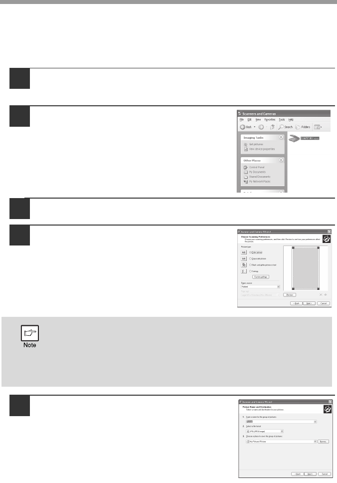 The procedure for scanning with the "Scanner and Camera Wizard" in Windows XP