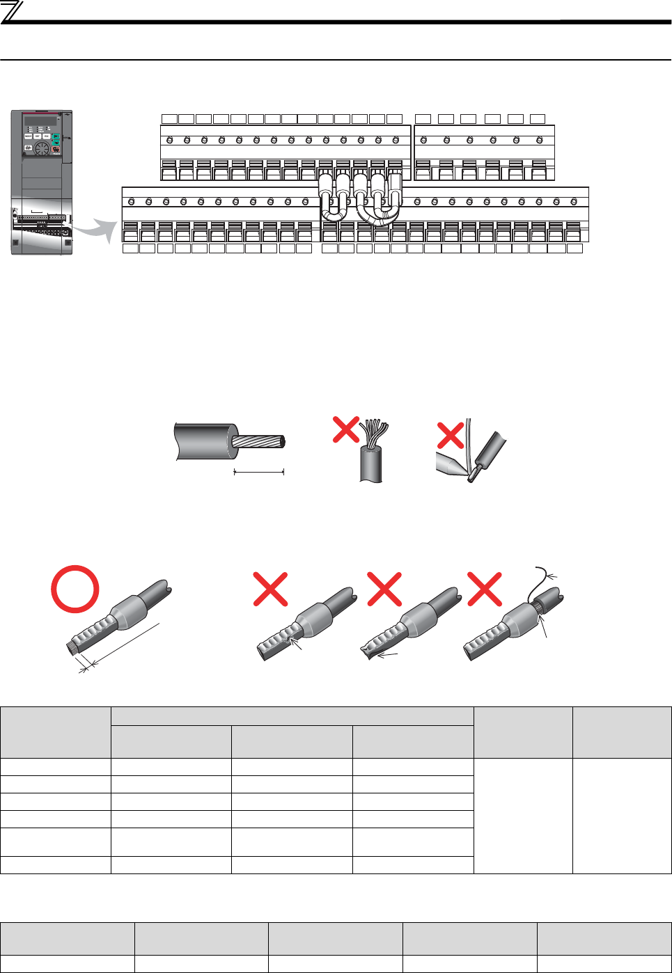 For the control circuit wiring, strip off the sheath of a cable, and use it with a blade terminal. For a single wire, strip off the