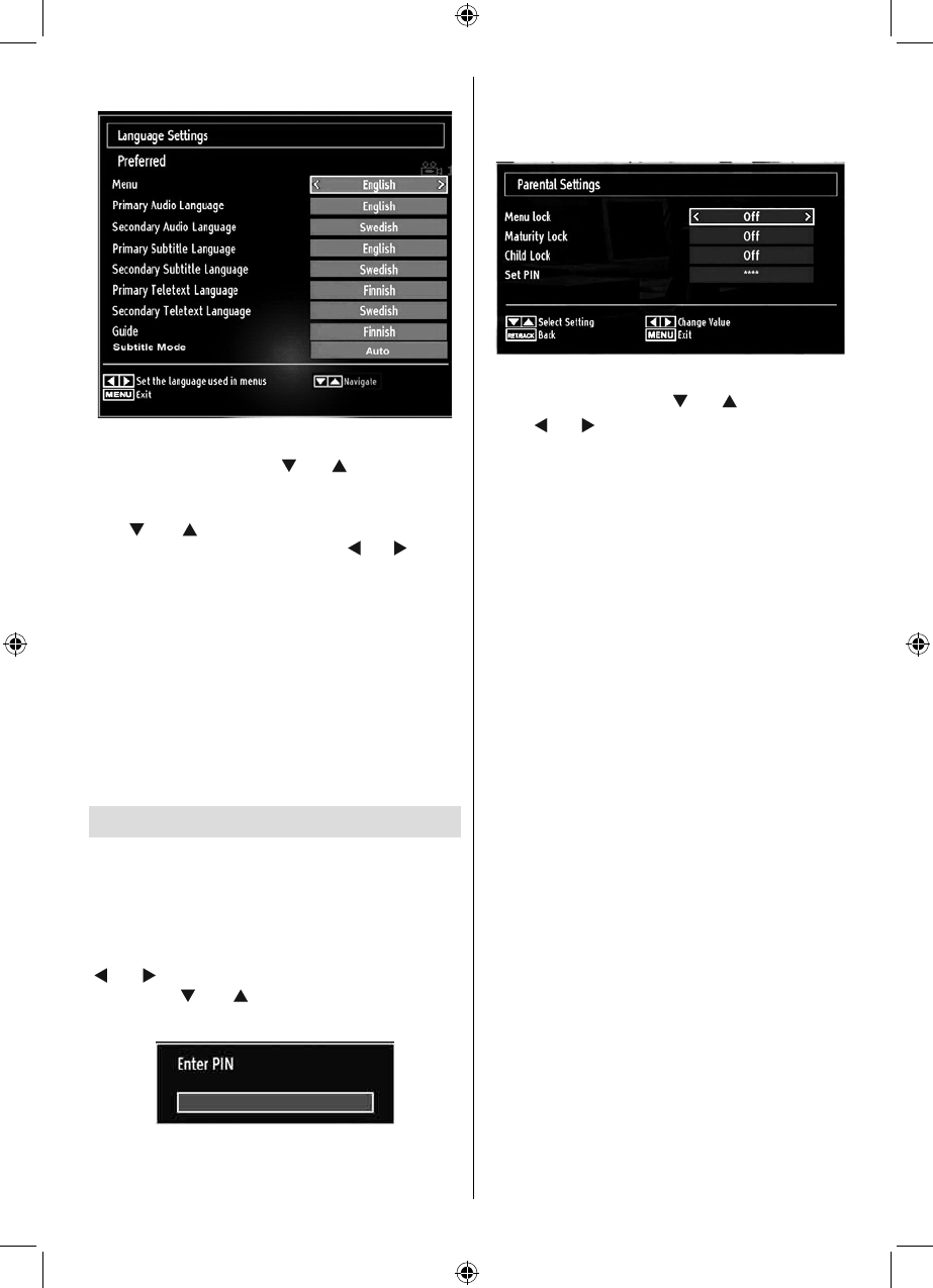 To display parental lock menu options, PIN number