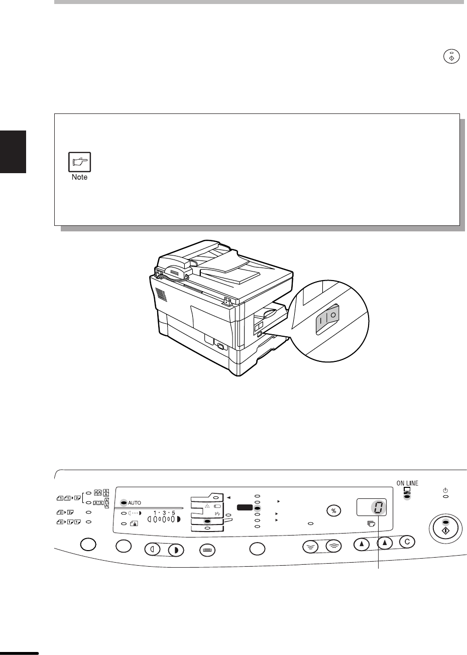 Turn the power switch on the left side of the copier to the “ON” position. The ready ( )