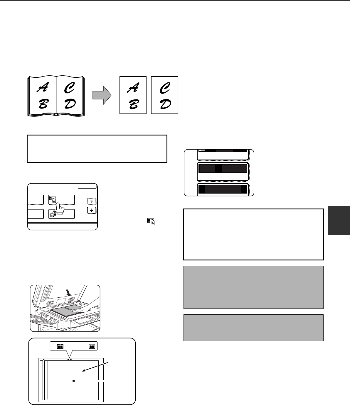 The dual page copy function produces separate copies of two documents placed side by side on the document glass.