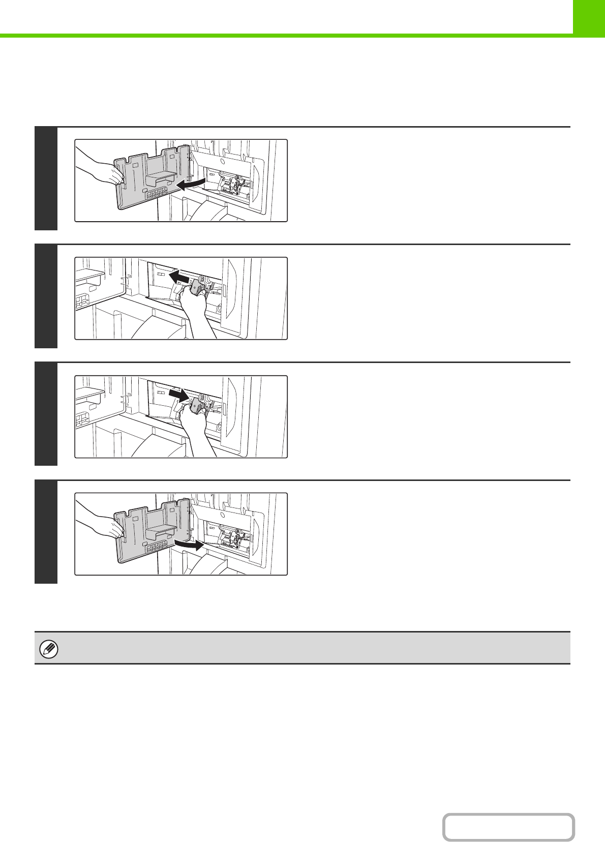 Before starting this procedure, remove all output from the output tray of the saddle stitch finisher. Do not replace