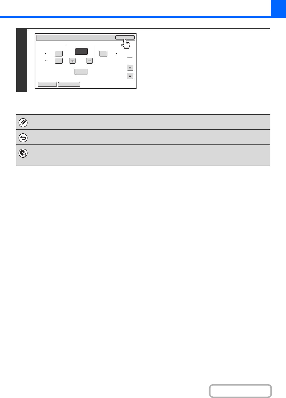 To return the ratio setting to 100%, touch the [Copy Ratio] key to display the ratio menu and then touch the [100%] key.