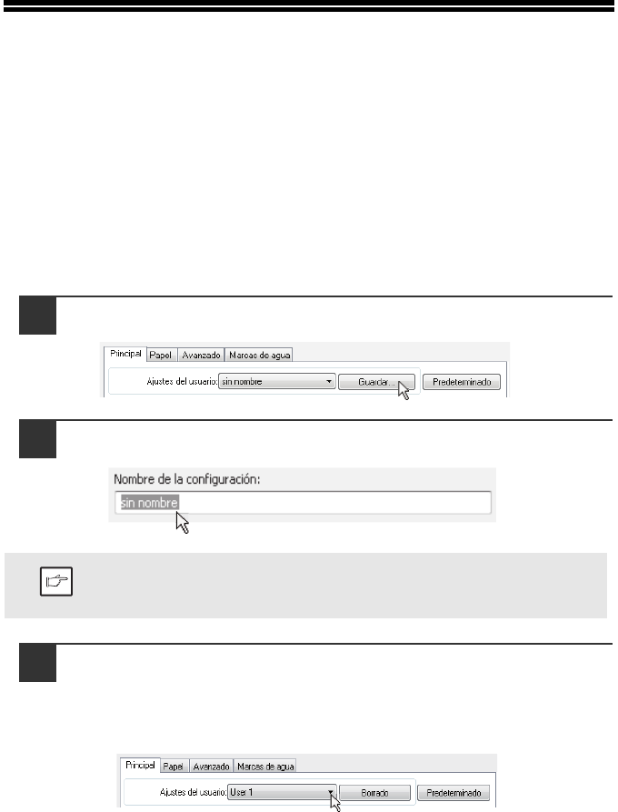 Los ajustes configurados en cada ficha en el momento de la impresión pueden guardarse