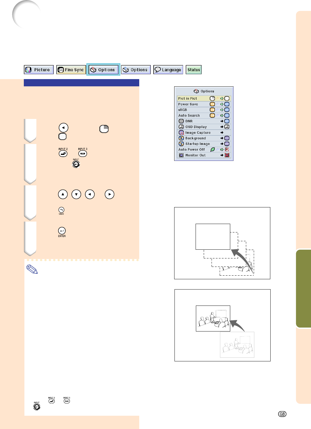 display the image input from INPUT 2 or 3 as an inset picture overlapping the main picture