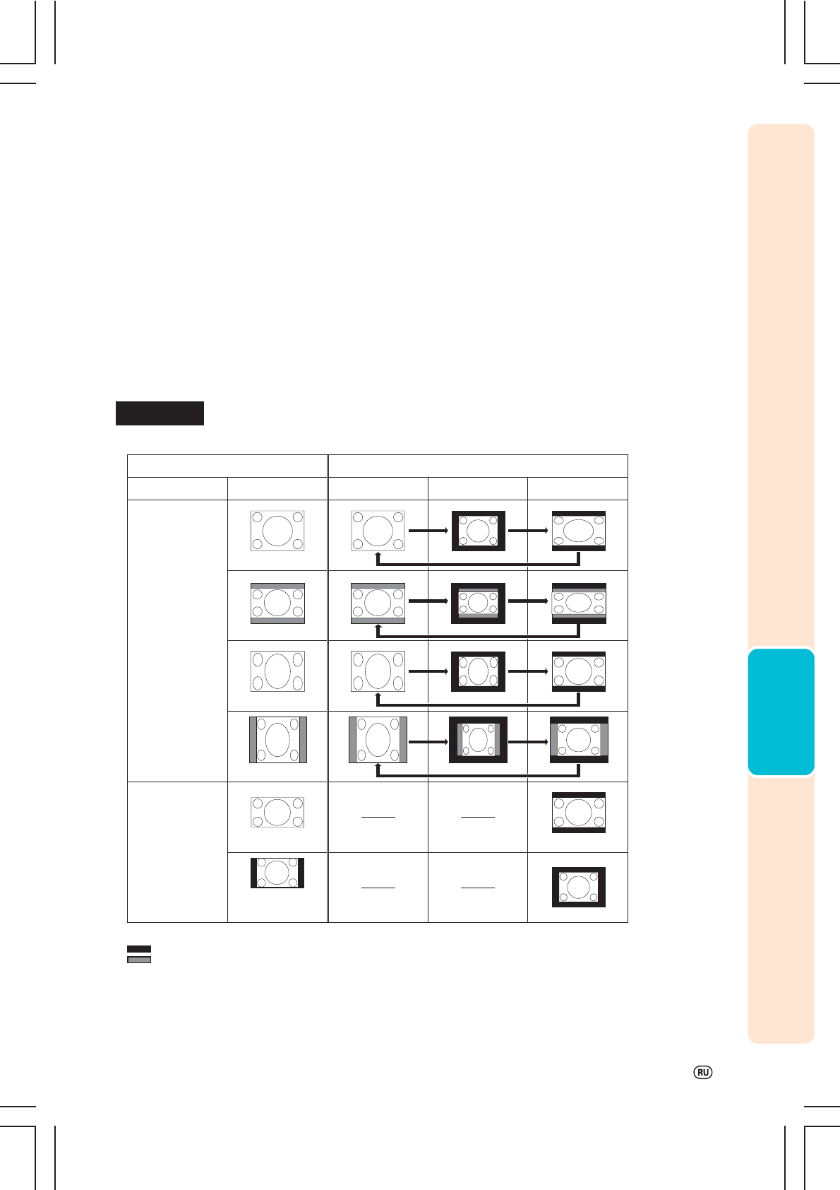 "STRETCH" является фиксированным режимом при входных сигналах 540P, 720P или 1080