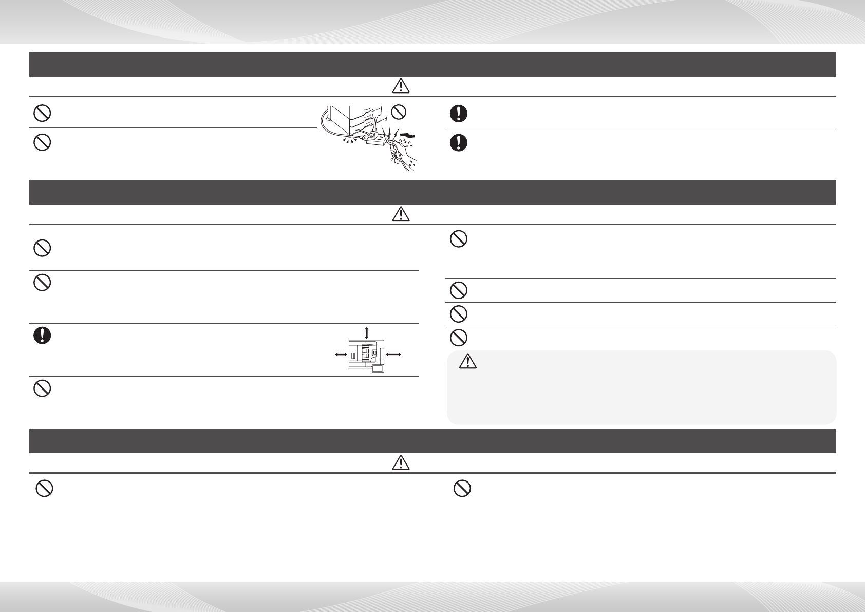 Be sure to connect the power cord only to a power outlet that meets the specied voltage and current