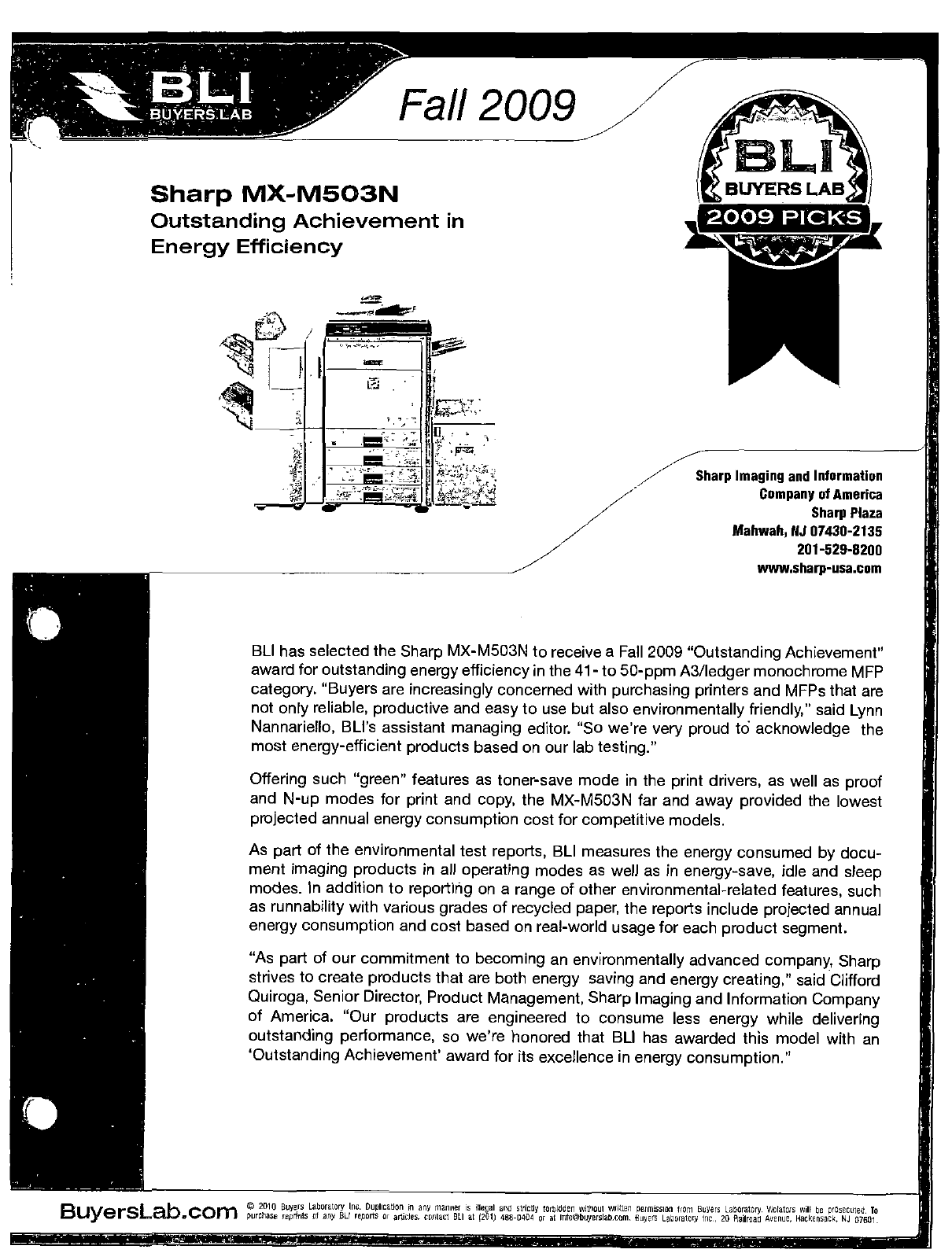 BLI has selected the Sharp MX-M503N to receive a Fall 2009 "Outstanding Achievement"