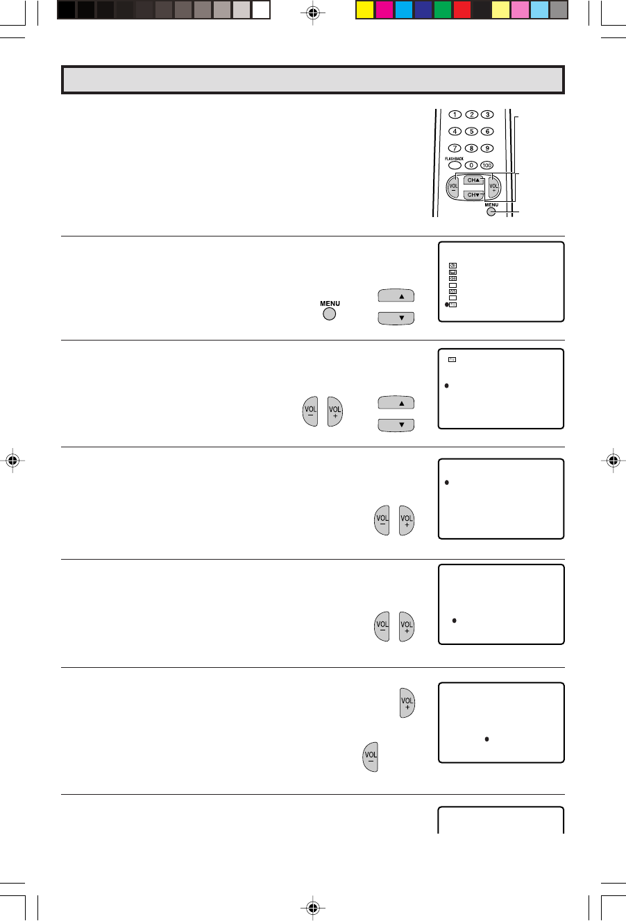 4 Press VOL +/– to access the CH SETTING screen.