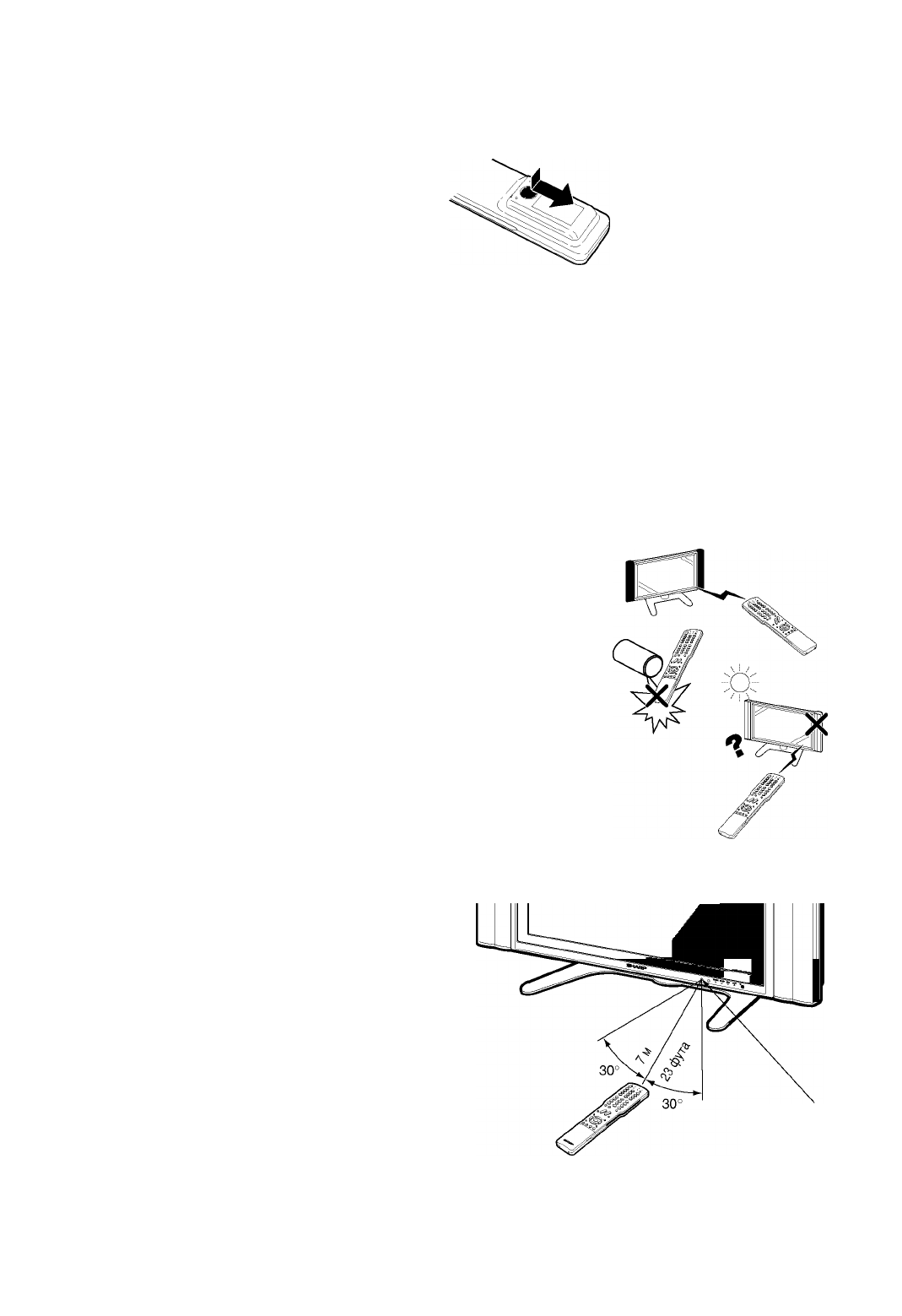 Перед использованием телевизора в первый раз вставьте две батареи размера “AAA” (прилагаются). Когда батареи разрядятся,