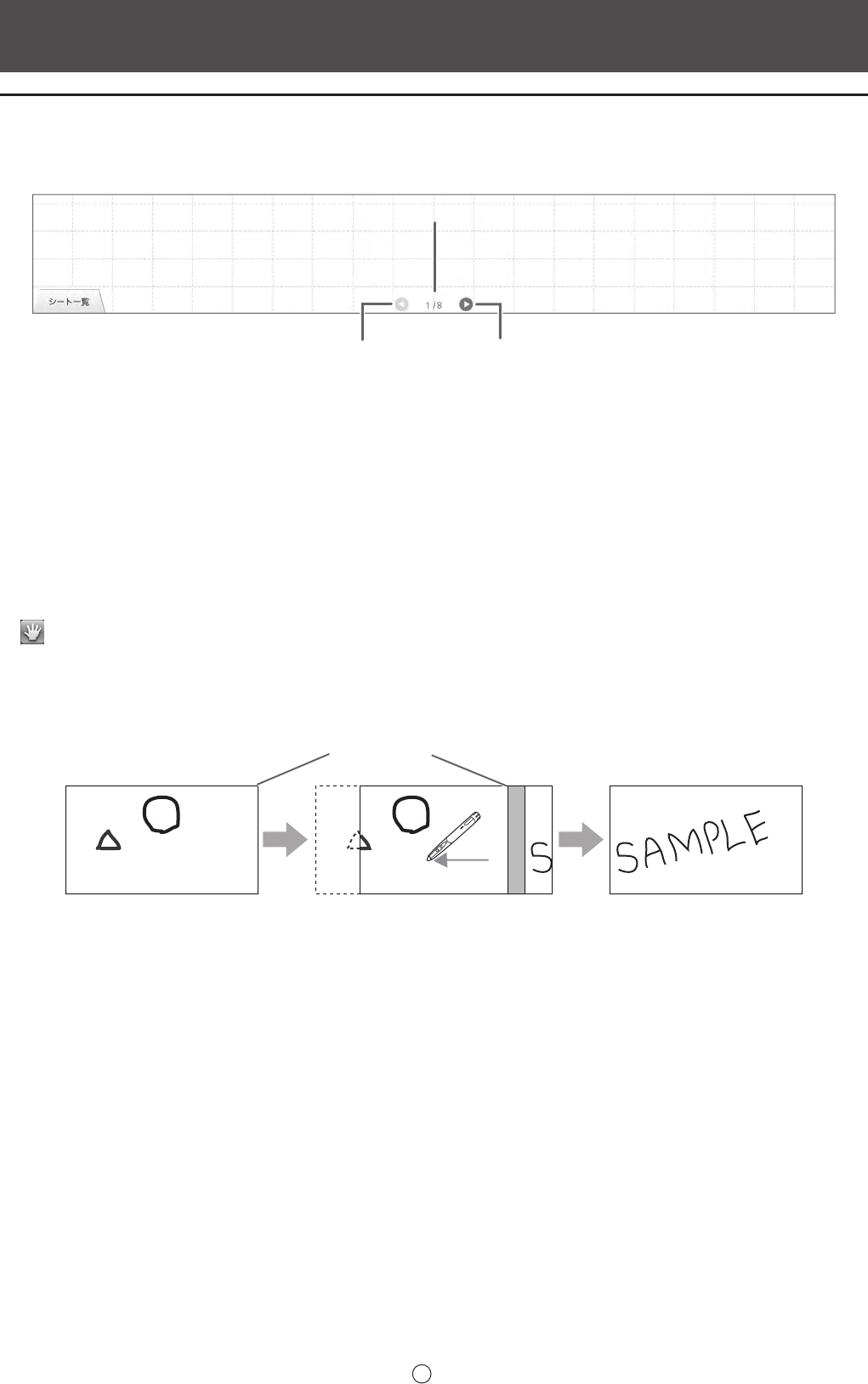 シートを変えるときは、画面下にあるシート送りボタンをタッチしてください。中央に表示されているのが、現在のシートです。